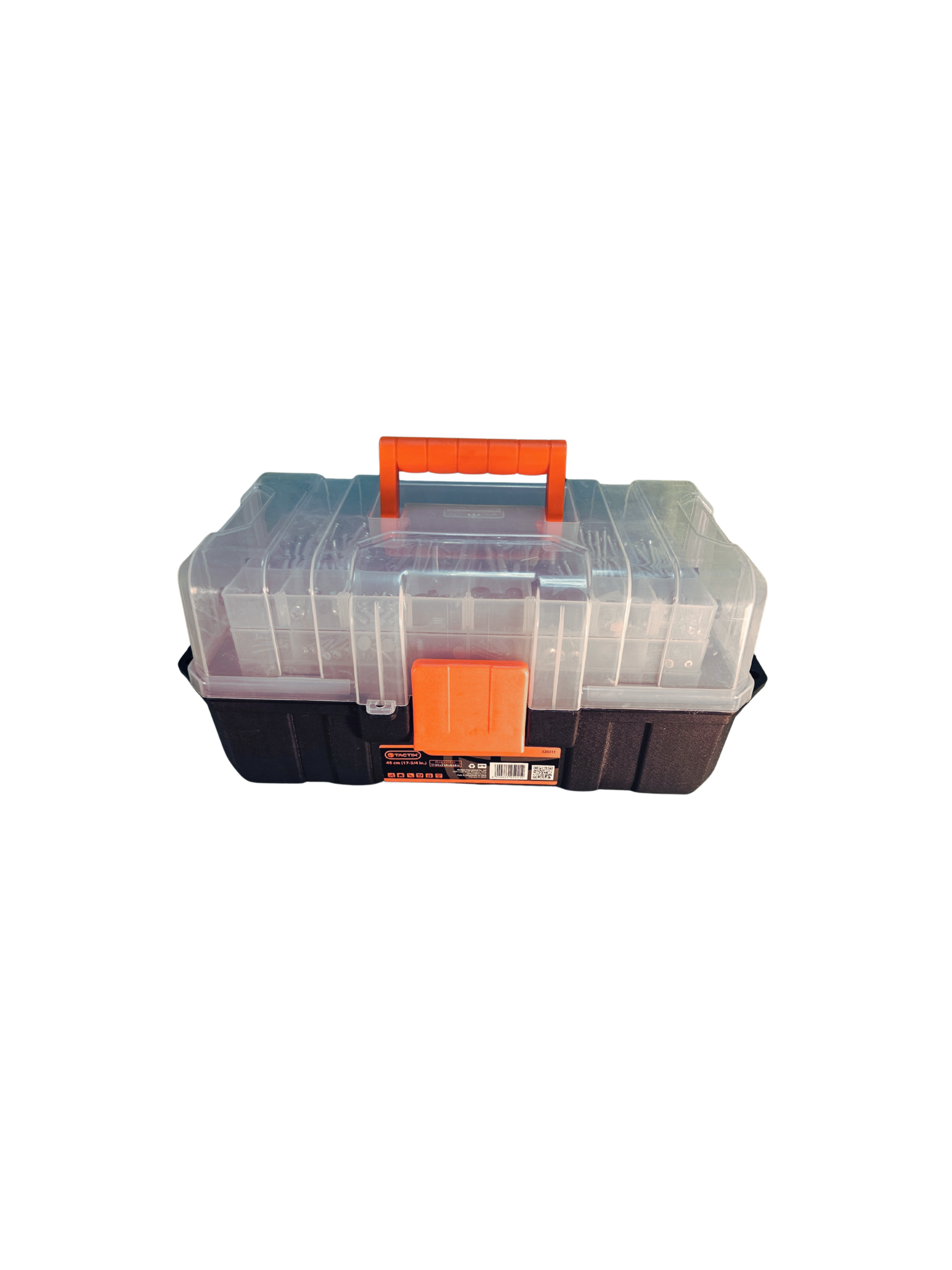 Cuenta con una tapa transparente, que permite ver el contenido sin necesidad de abrirla, y múltiples compartimentos internos para una organización eficiente. Su asa superior ergonómica facilita el transporte, convirtiéndola en una opción cómoda tanto para el hogar como para trabajos ocasionales.