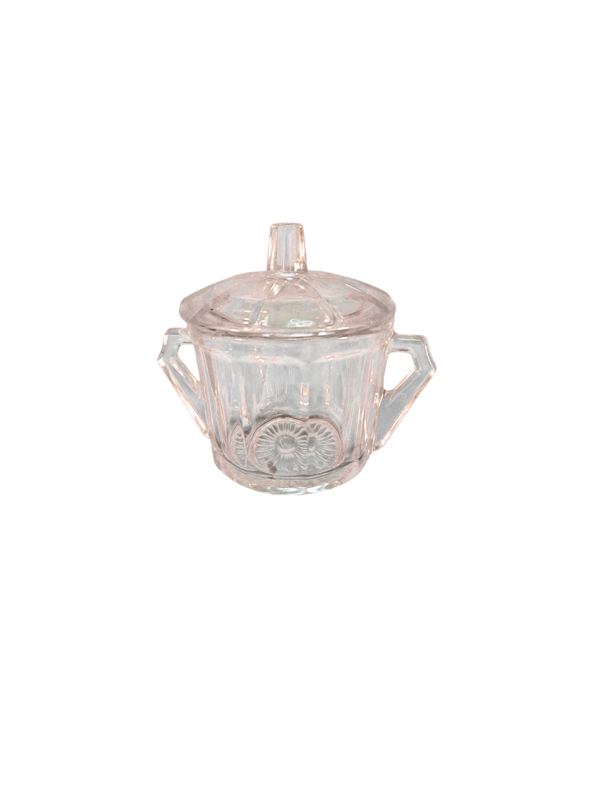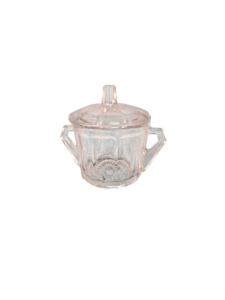 Envase de vidrio transparente con tapa y asas laterales. Ideal para almacenar azúcar, dulces o pequeños alimentos.