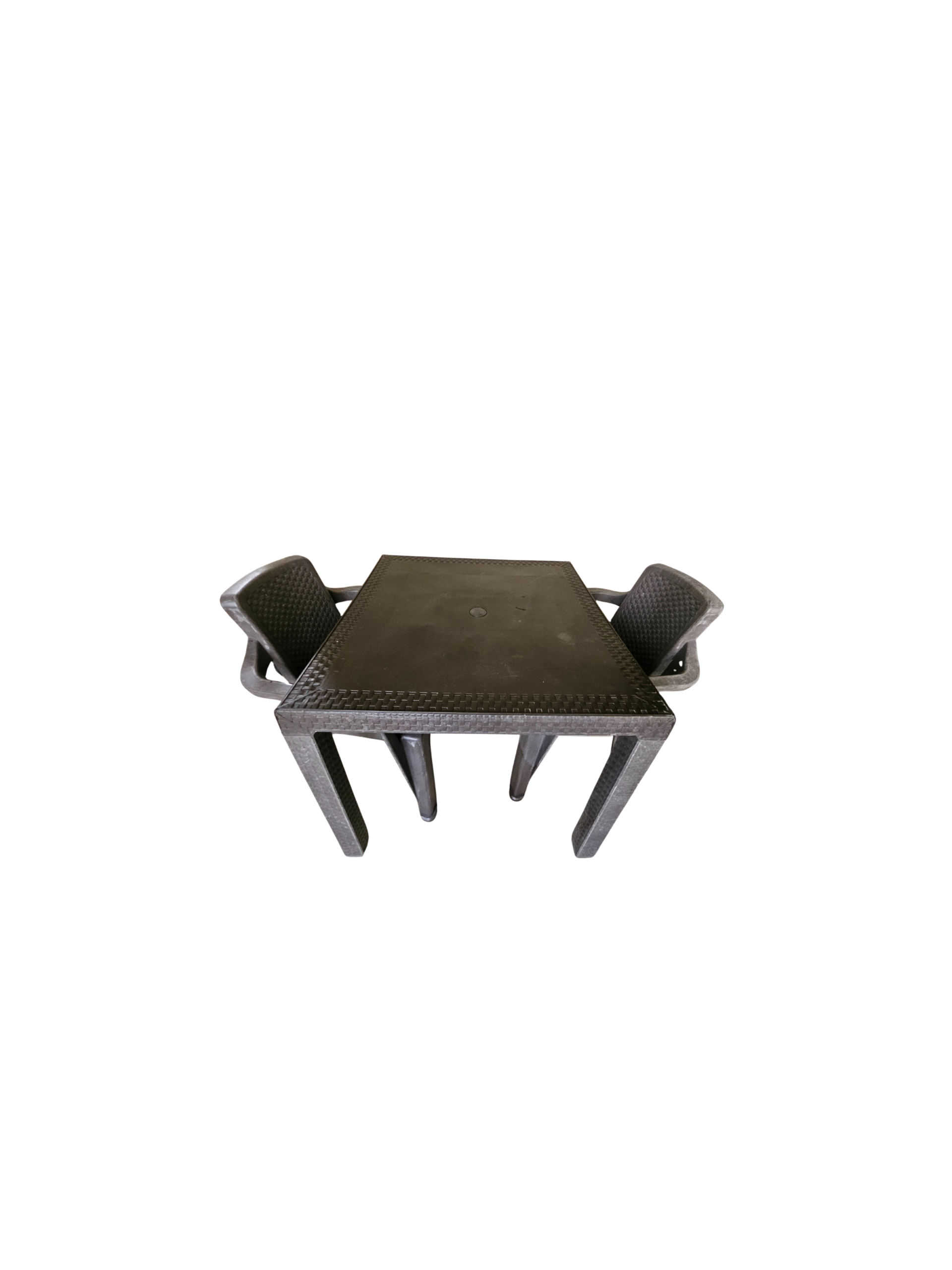 Juego de mesa con dos sillas de ratán. Ideal para terraza, balcón o interior. Diseño liviano y funcional, perfecto para desayunos o espacios pequeños.