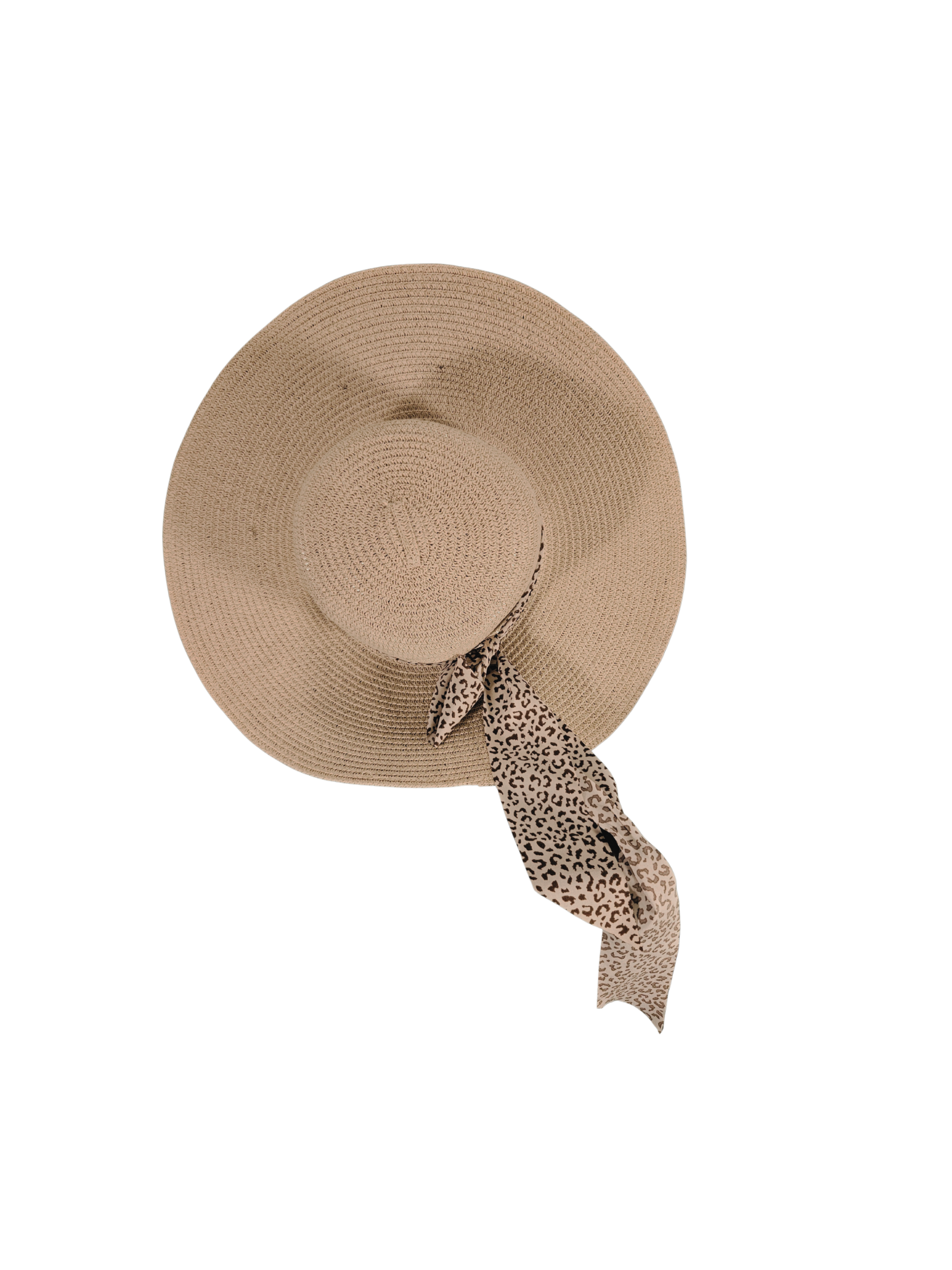 Sombrero tejido en color beige, con cinta decorativa animal print de ala ancha y diseño cómodo, perfecto para protegerse del sol en actividades al aire libre, viajes o uso diario. Estilo neutro y fácil de combinar. Se encuentra en buen estado, con signos normales de uso.